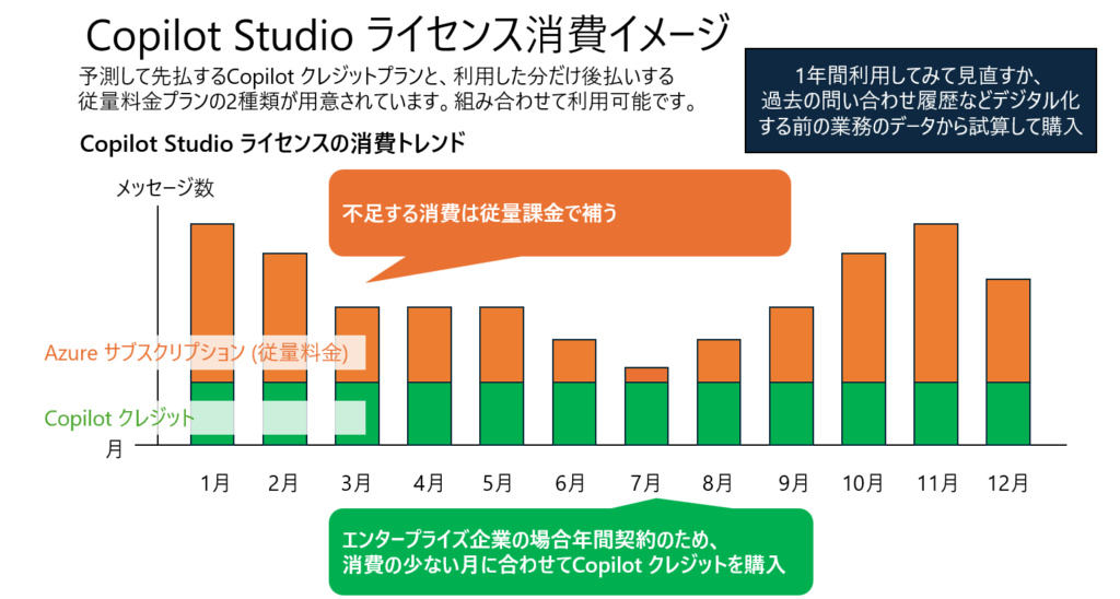 1年間利用してみてベースラインを確認してからCopilotクラジットを購入するか、過去の問い合わせ数などの業務やPoCから試算して最低限の量のクレジットを購入し、従量料金プラント組み合わせて契約します。