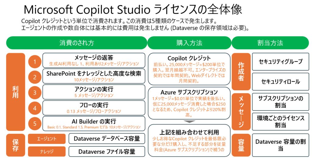 Copilot Studio のライセンスは以下の観点で発生します。利用の観点、保存の観点を抑えておく必要があります。
