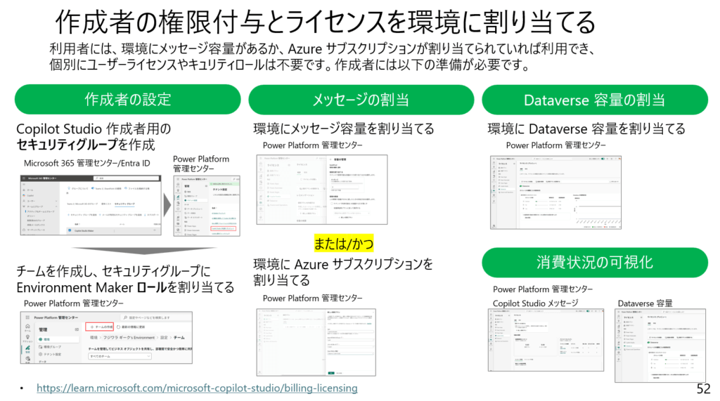 管理者がライセンスを購入し、テナントに割り当てます。 - Power Platform 管理センターで環境ごとに割り当て