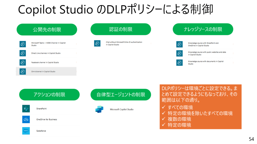 Copilot Studio を安全に運用するためには、DLP(データ損失防止)ポリシーの設定が不可欠です。DLP ポリシーを使うことで、エージェントが接続できるデータソースやサービスを制限し、組織の情報漏洩リスクを低減できます。