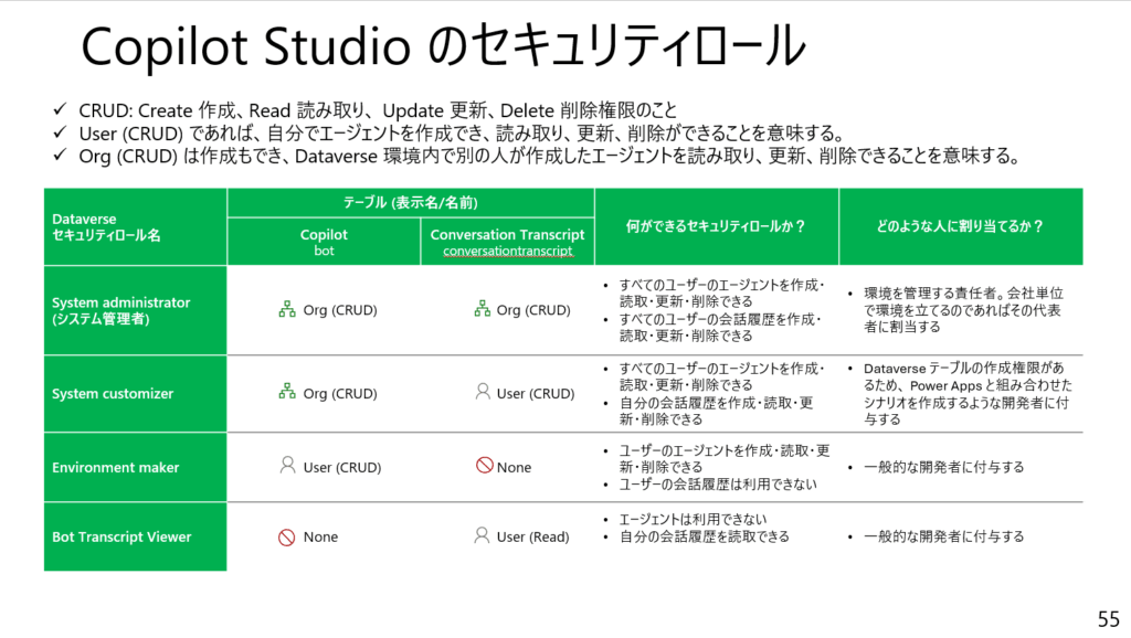 | Environment Maker | 環境内でアプリやフロー、Copilot Studio エージェントを作成するために必要。 |