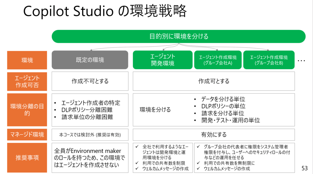 ユーザー管理の明確化:環境ごとにアクセス権限を制御でき、Copilot Studio を利用できるユーザーを限定可能。