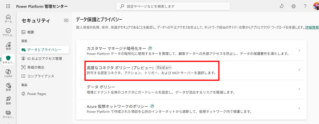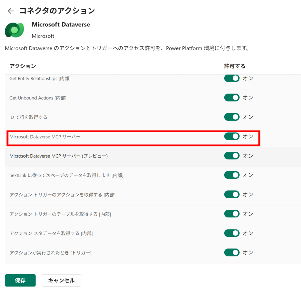 - 高度なコネクタポリシーで Dataverse MCP Server のアクション 「Microsoft MCP サーバー」 がオンになっている