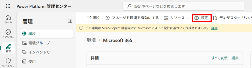 Microsoft Copilot Studio App の 「有効である」 =「はい」になっていることを確認します。