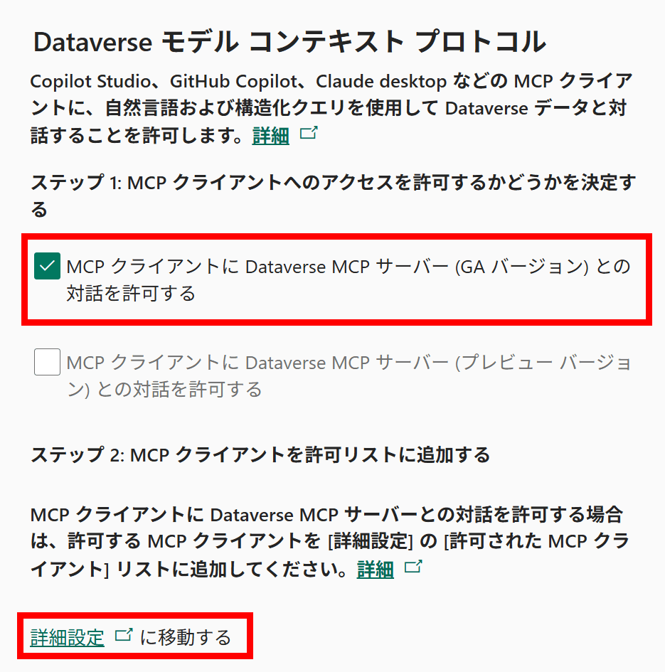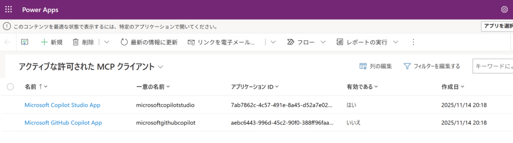 - Microsoft Copilot Studio App がMCP クライアントの許可リストに追加されている