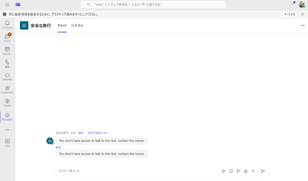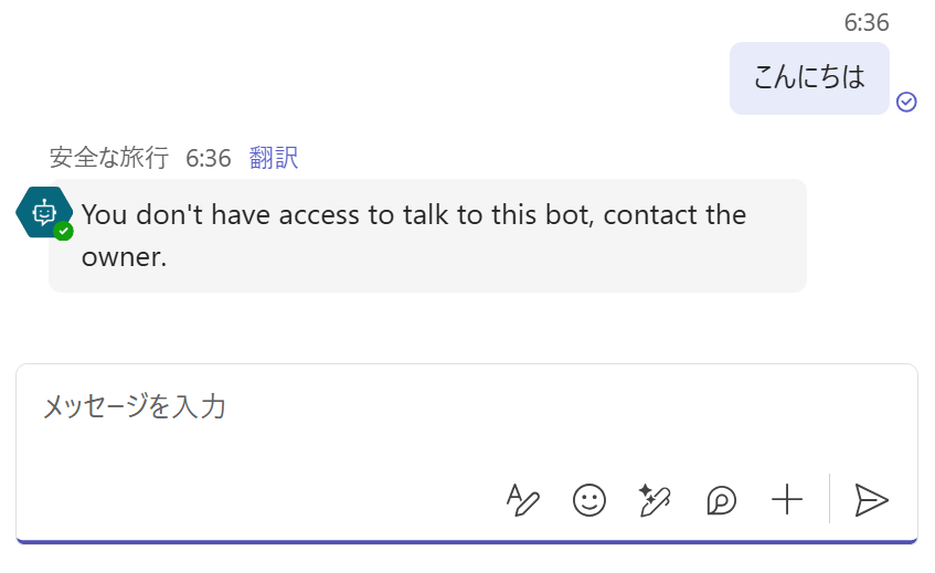 話しかけてみると、同じ回答(アクセス権限ないよ)しか返ってきません。