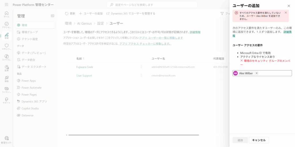 環境 – 環境セキュリティグループに属していないユーザーを環境に追加しようとしてみる