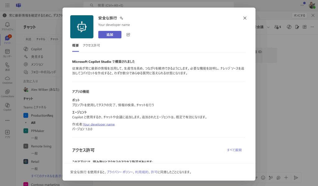 Teams チャネルへの追加を行ってエージェントへの利用ができるかを確認する