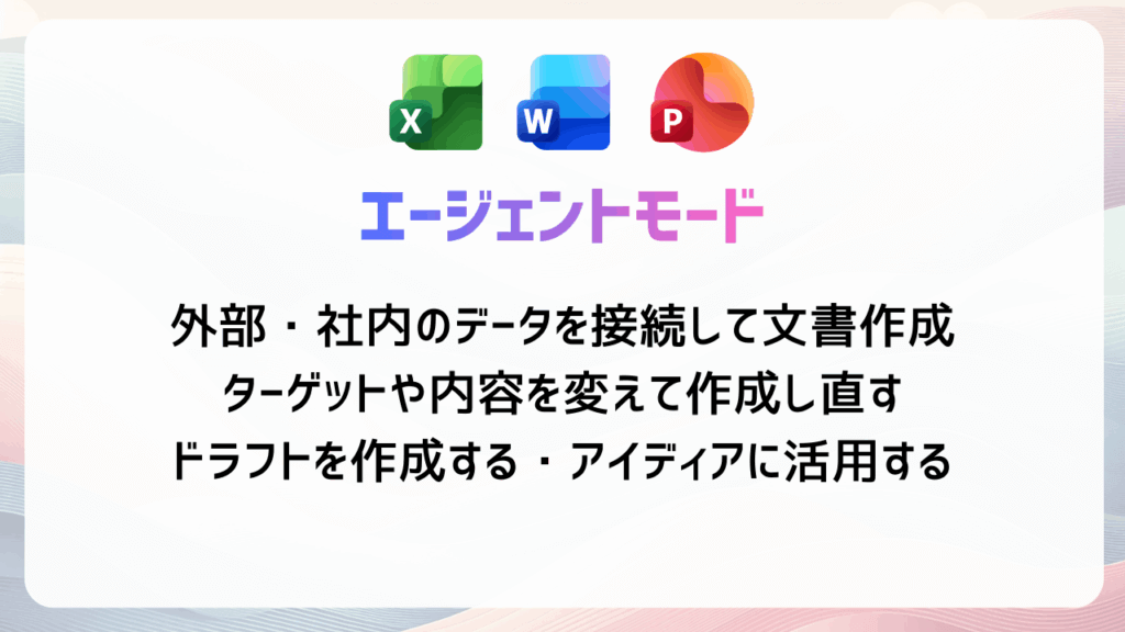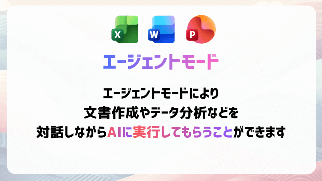 エージェントモードは、Microsoft 365 アプリに組み込まれた AI 機能で、文書作成・データ分析・プレゼン資料作成を AI が直接支援します。
