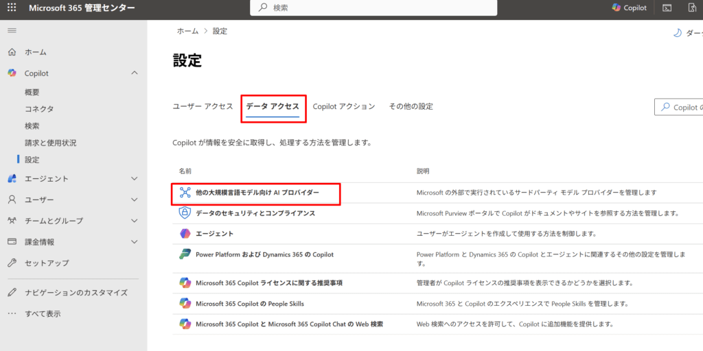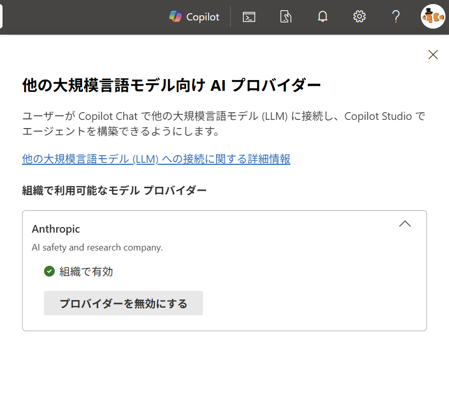 他の大規模言語モデル向け AI プロバイダーを有効化します。これはテナント全体への有効化が必要です