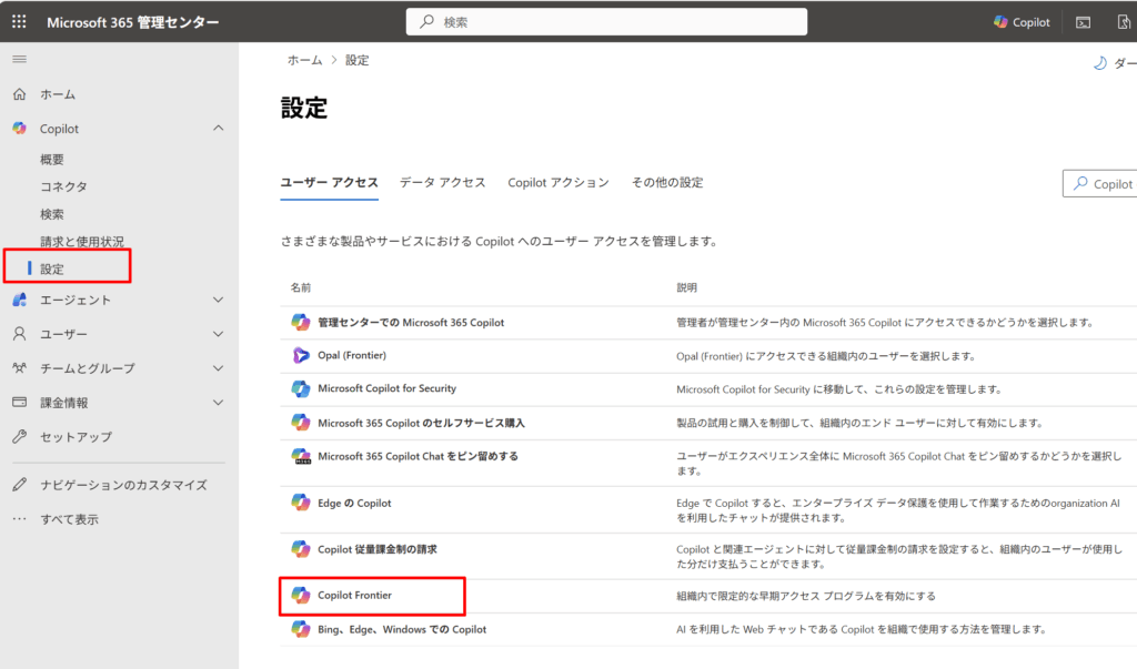 Microsoft 365 管理センター にて、Copilot > 設定 > Copilot Frontier を有効化する必要があります。