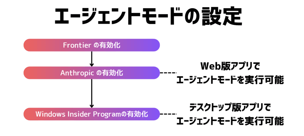 エージェントモードを利用できるWeb版のアプリ及びデスクトップアプリのどのレベルまで実行するかでエージェントモードの設定の項目が変わります。