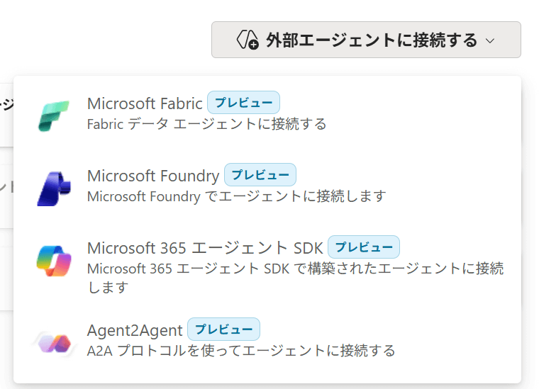 このようにエージェントのタブから追加します。外部エージェントに接続するボタンからMicrosoft Foundry があるので選択します。