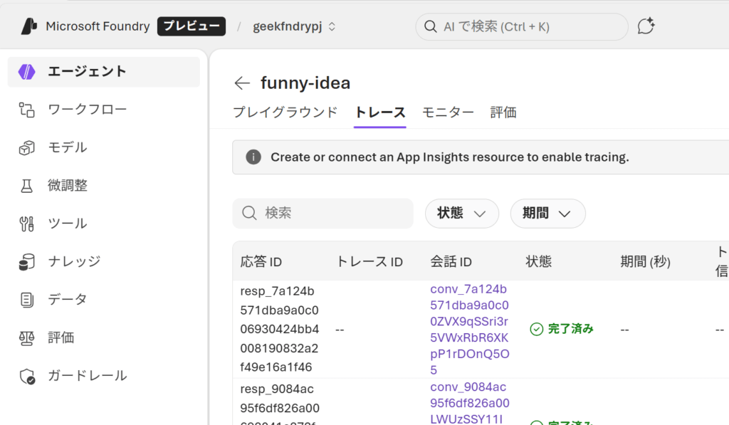 Microsoft Foundry には組み込みの実行ログのモニター機能があります。トレースタブを選択すると実行の一覧を確認することができます。