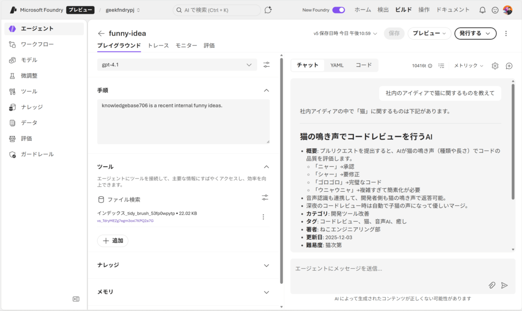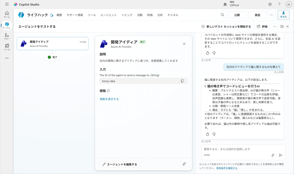 このような変わった社内アイディアについて答えてくれるエージェントを Microsoft Foundry でテスト用に開発しました。
