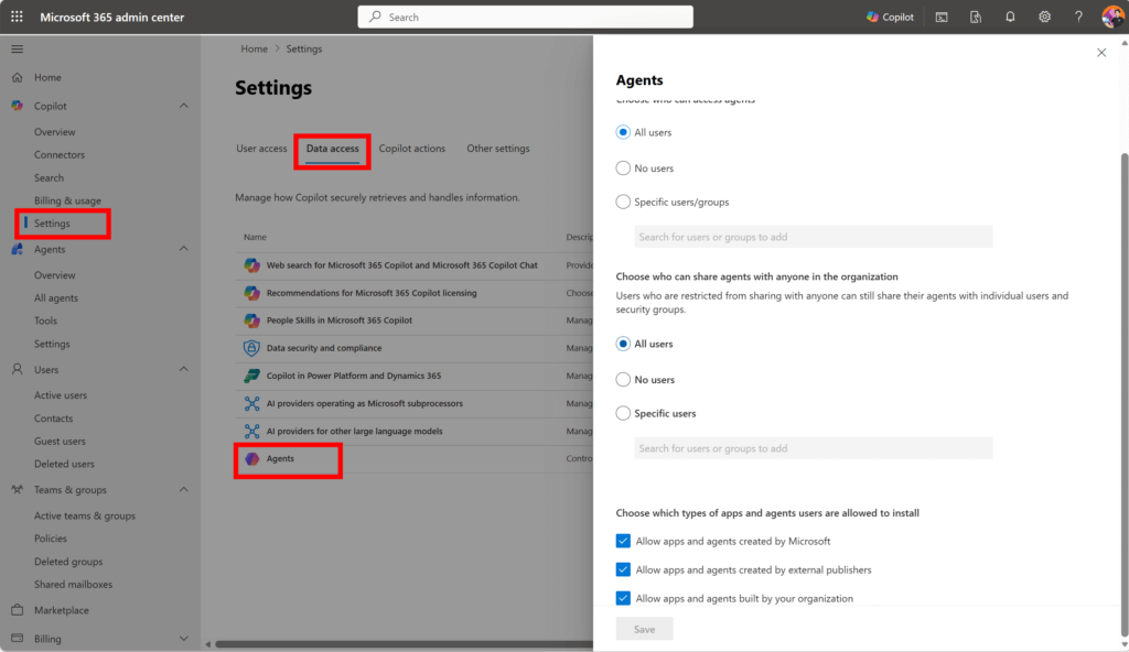 Microsoft 365 管理センター → Copilot → Settings → Data access → Agents