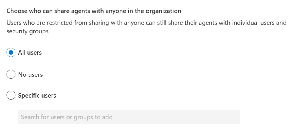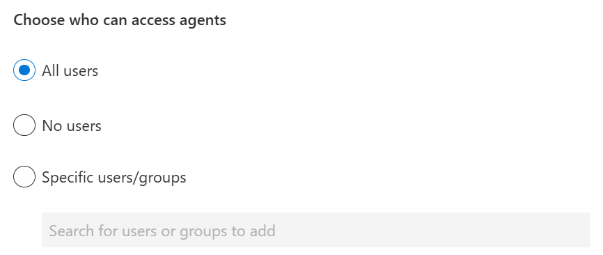 こちらはテナント全体における、エージェント全般の設定です。基本的にはAll users でよいでしょう。そうしないと、Microsoft 純正のエージェント含む様々なエージェントの恩恵を受けることができなくなります。
