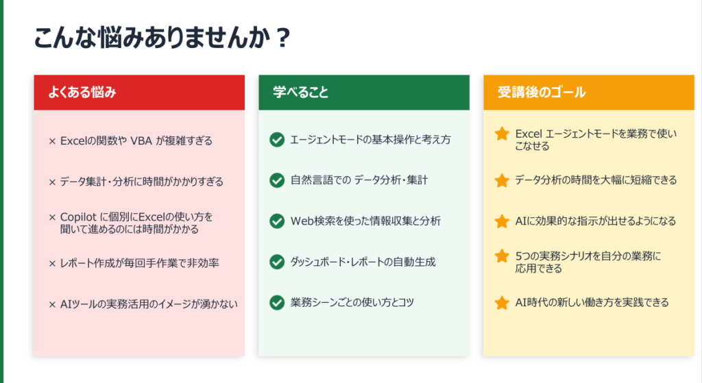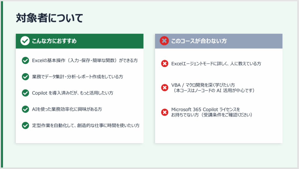 - VBA / マクロ開発を深く学びたい方(本コースはノーコードのAI活用が中心です)