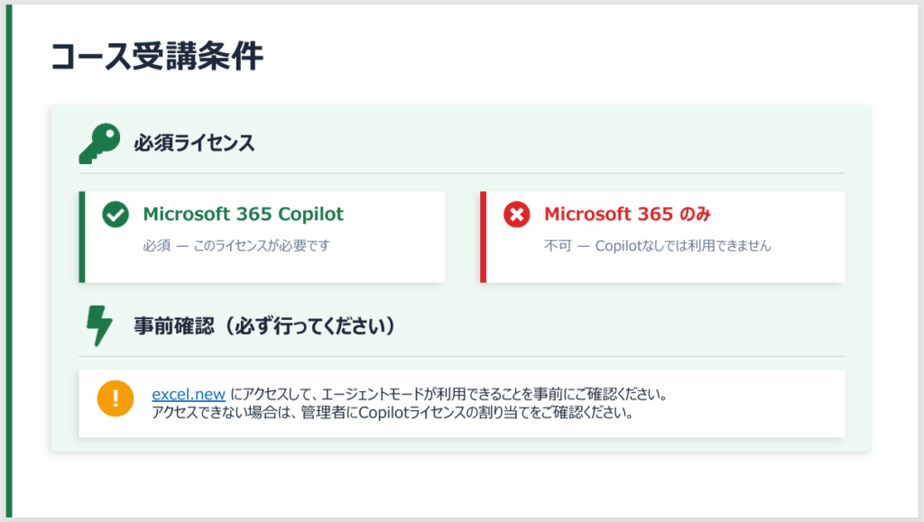 - Microsoft 365 Copilot ライセンスが必須です(Microsoft 365のみでは利用できません)