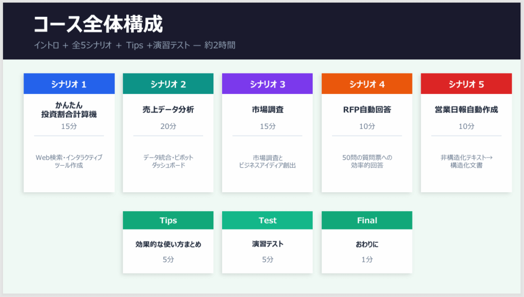 このコースでは、約2時間・全5シナリオのハンズオンを通じて、エージェントモードを実務で使いこなすスキルを身につけます。