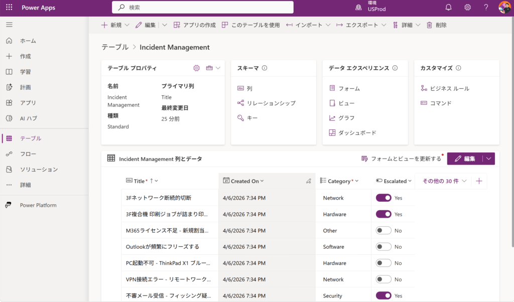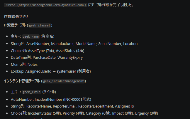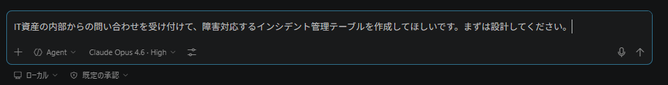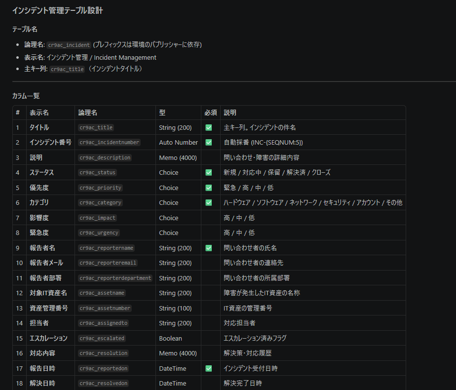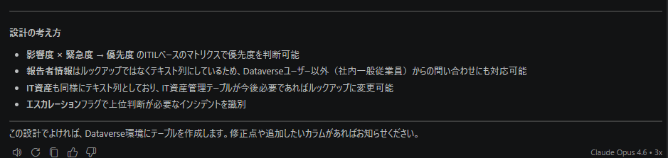 Dataverse テーブルの設計をしてもらいます。今回はインシデント管理テーブルを作成してみます。このようなプロンプトで依頼します。