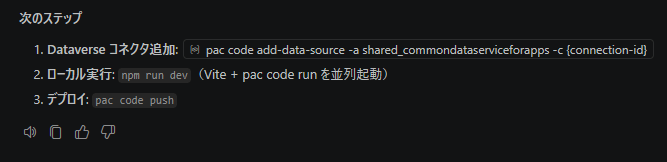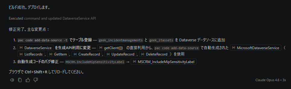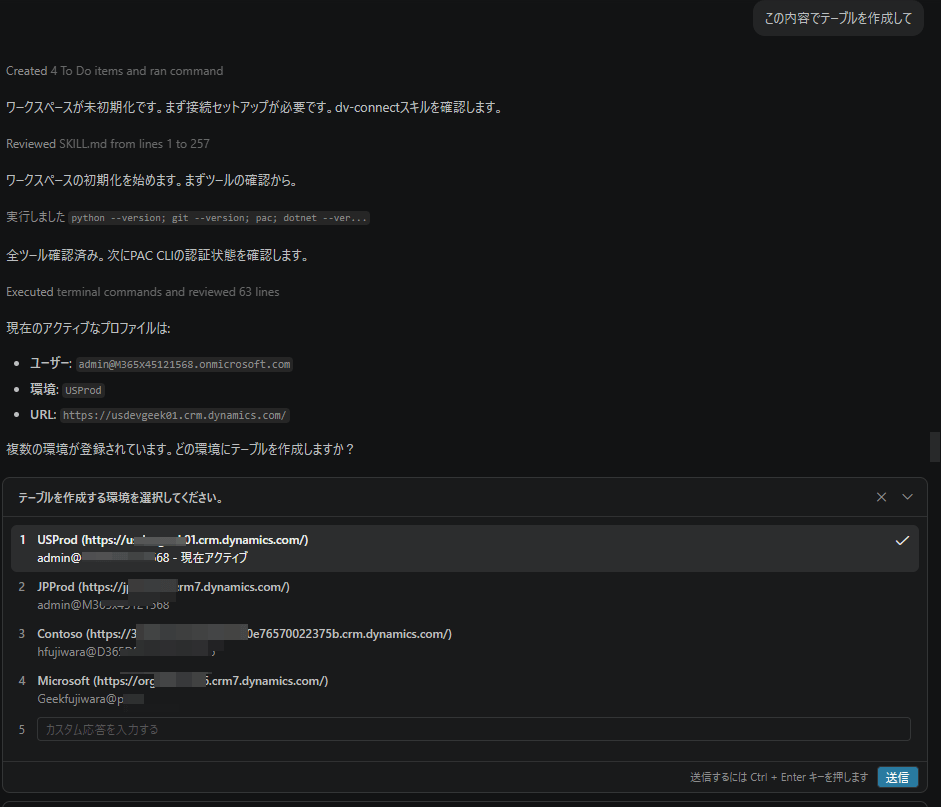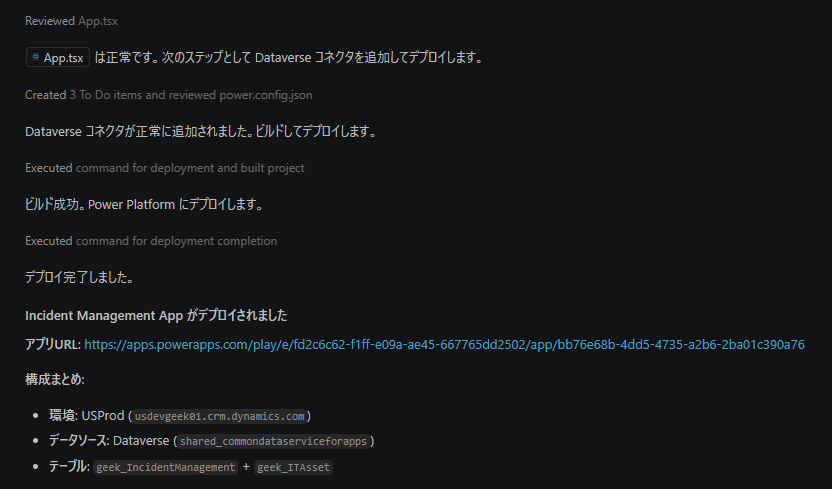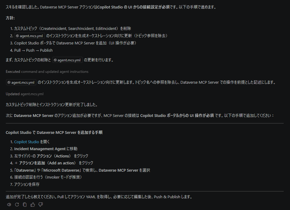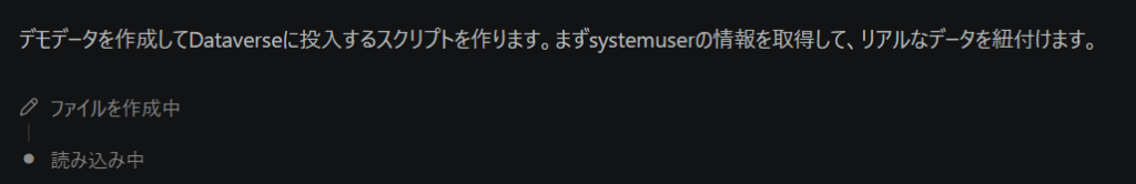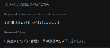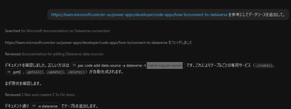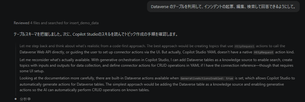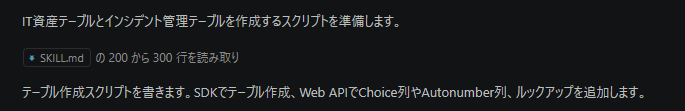 面白い動きになりました。スキルの有無を特に言わなくても自然に理解して Dataverse API 経由で作成する判断を GitHub Copilot 自身が行いました。