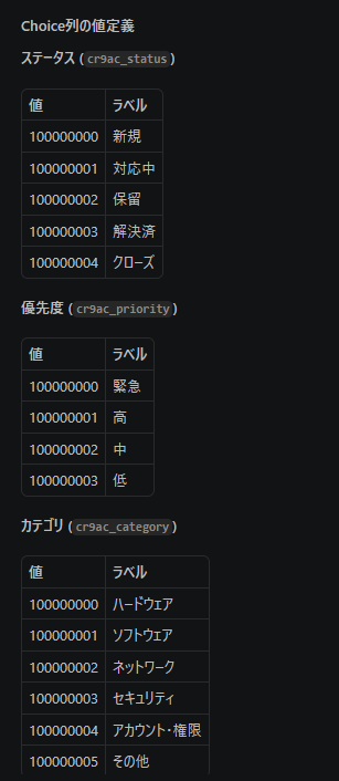 手動で設定するには選択肢型などの調整が手間がかかるのですが、Dataverse をVS Code 経由で行うと非常に簡単に設定できることがわかりました。