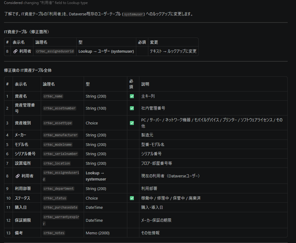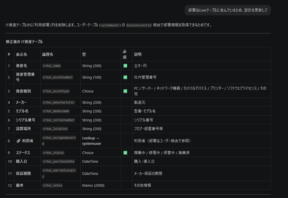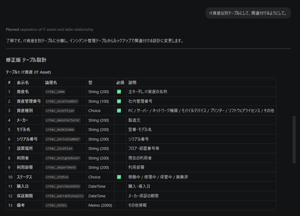 IT資産は別テーブルにして、関連付けるようにして。追加テーブルとリレーションシップの設計も問題なく実施してくれました。