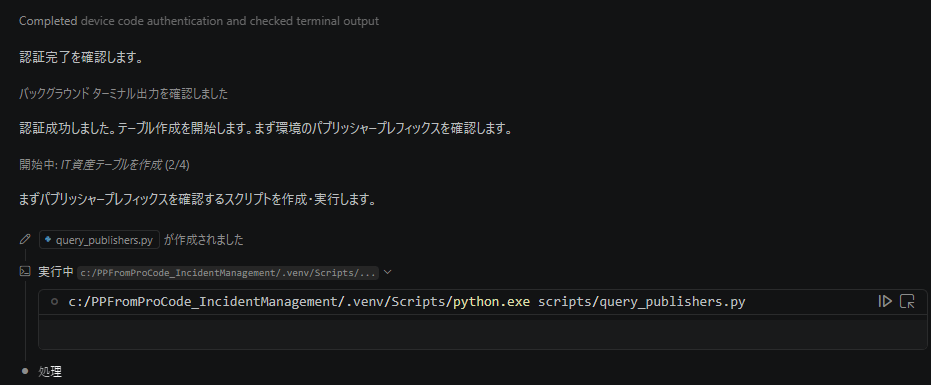 認証を求められます。デバイスコードでの認証でした。環境にアクセスできるアカウントで実行します。