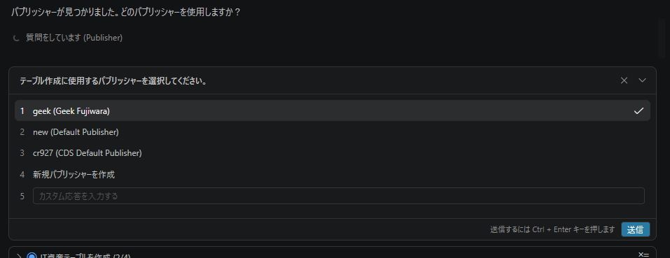 この内容でテーブルを作成してテーブルを作成する先の環境をAsk user 形式で提供してくれました。