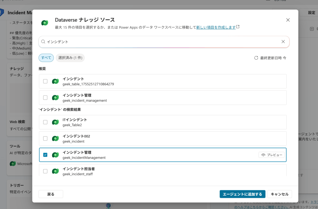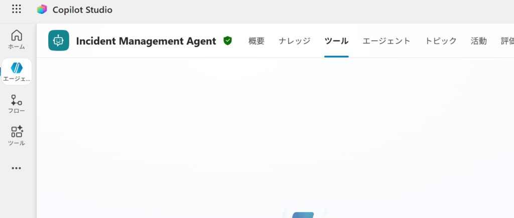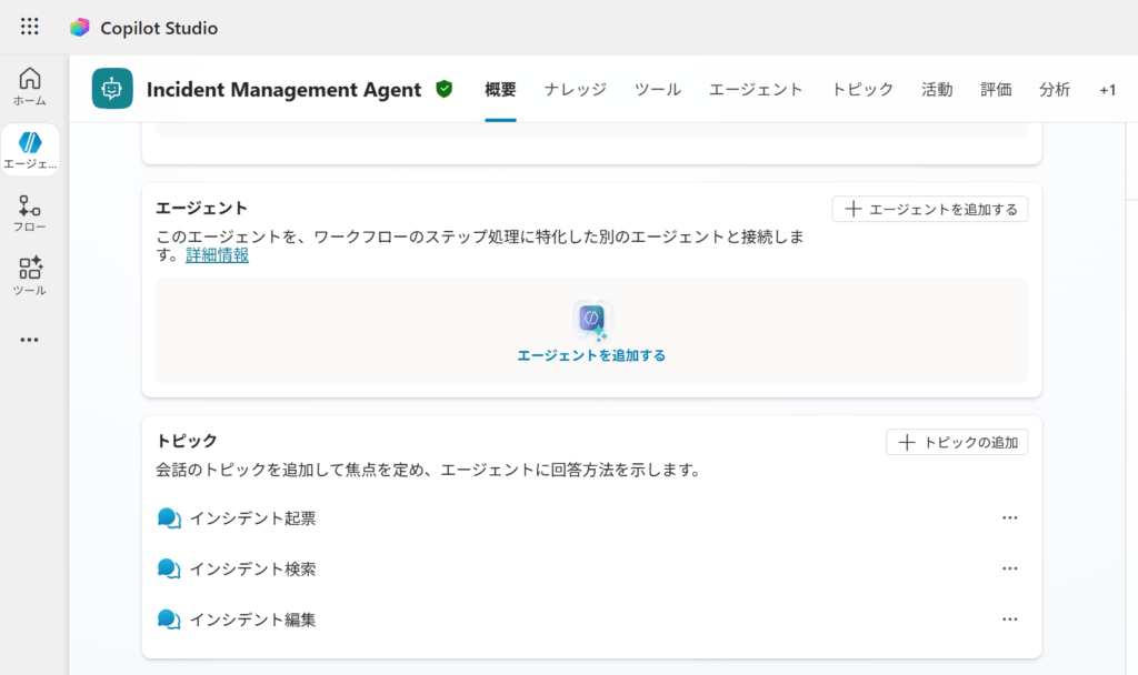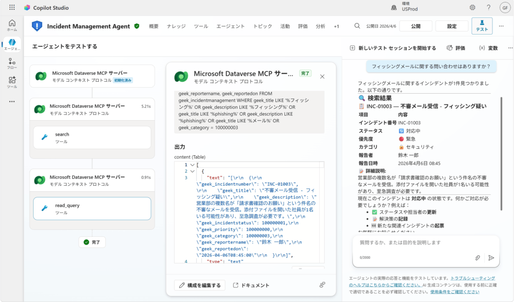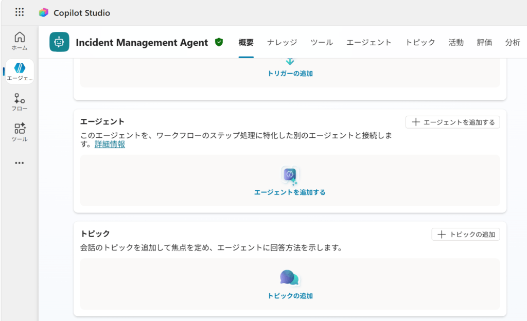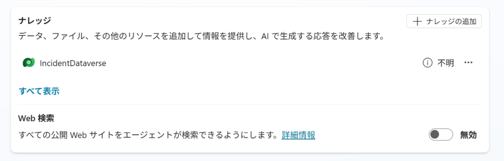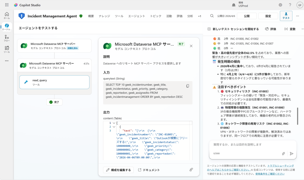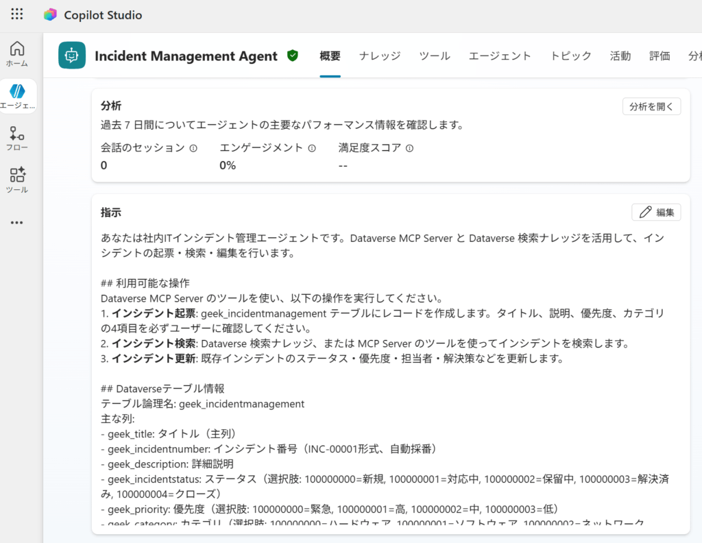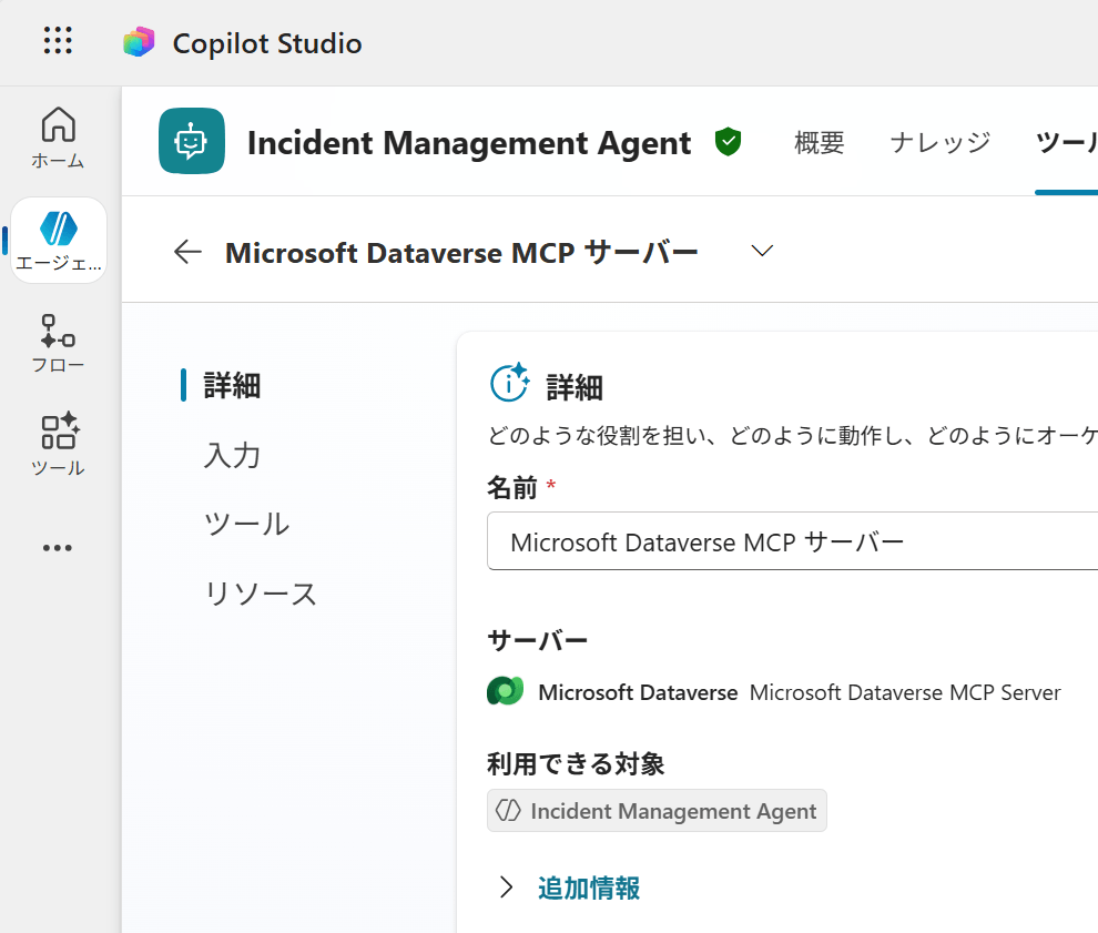 Dataverse の検索は、 作成した geek_IncidentManagement テーブルを利用する。また、Dataverse MCP Server を利用して起票などを行えるようにする。 さらに、 生成オーケストレーションを活かすため、トピックはカスタムで利用しない。実行結果を見ると、 Copilot Studio に Dataverse MCP Server は自動て追加できないとあります。手動での追加方法が案内されました。