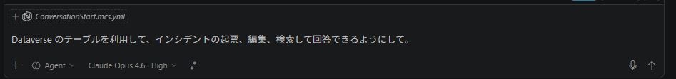 今回はVS Code からすべての操作を実行したいため、Dataverse API経由で作成してもらいます。新しいエージェント「IT資産管理エージェント」を作成してもらいます。