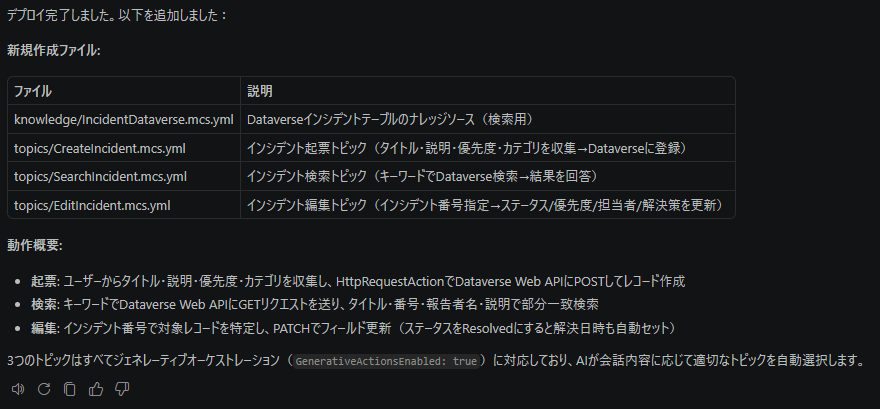 この実装方針は指定しないと迷走しているようです。現在は 生成オーケストレーションにて Dataverse MCP Server を利用するのが最も良い方法なのに、トピックを作成して対応しようとしています。