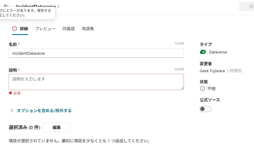 ナレッジへの Dataverse テーブル追加は 失敗することがある