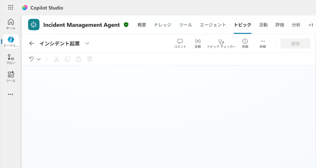 次に、インシデント起票のトピックを確認してみます。検索、編集、起票のトピックが作成されていますが、内容がありません。コードエディターでも開くことができません。