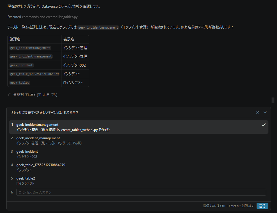 続けて、ナレッジのDataverseテーブルも正しいテーブルに更新するように指示します。あえてスキーマ名を指示に入れず、どこまで対応できるか試してみます。