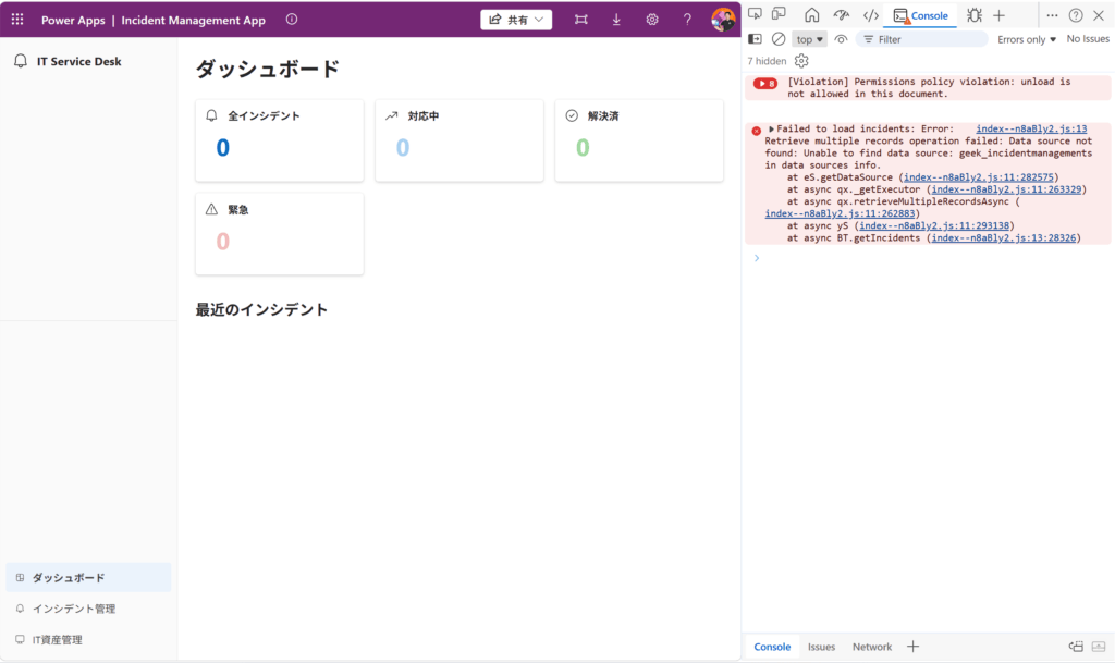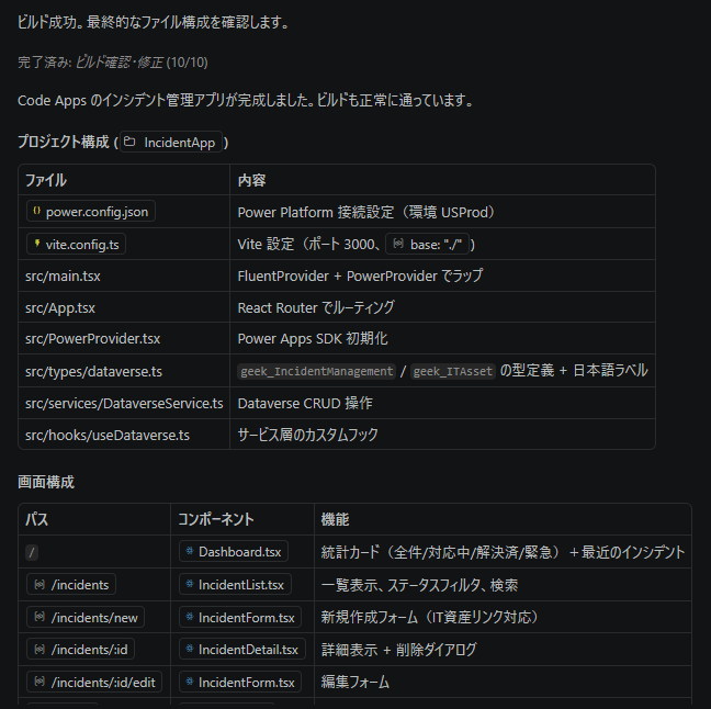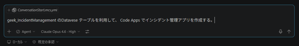 アプリの作成を進めます。今度は VS Code でCode Apps でインシデント管理アプリを作成するように指示します。デザインは