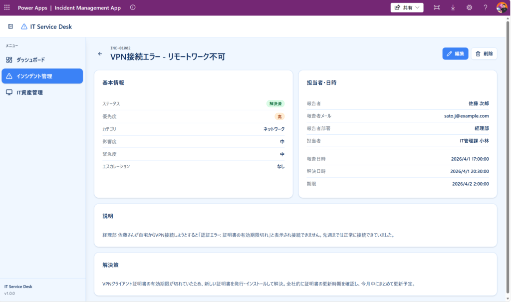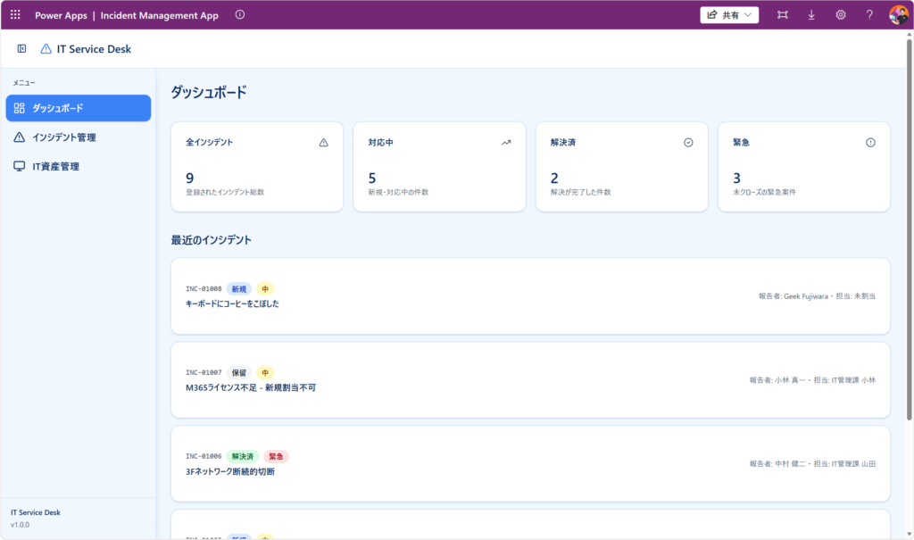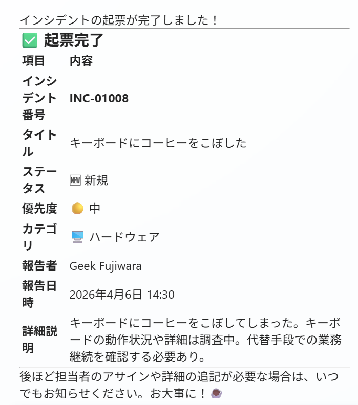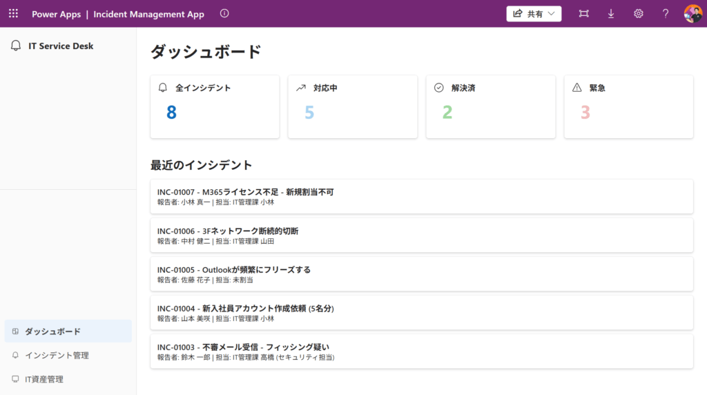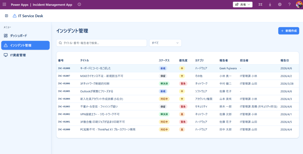 IT資産の内部からの問い合わせを受け付けて、障害対応するインシデント管理テーブルを作成してほしいです。まずは設計してください。いきなり開発は行わせず、設計のみさせます。修正希望があれば追加で依頼します。